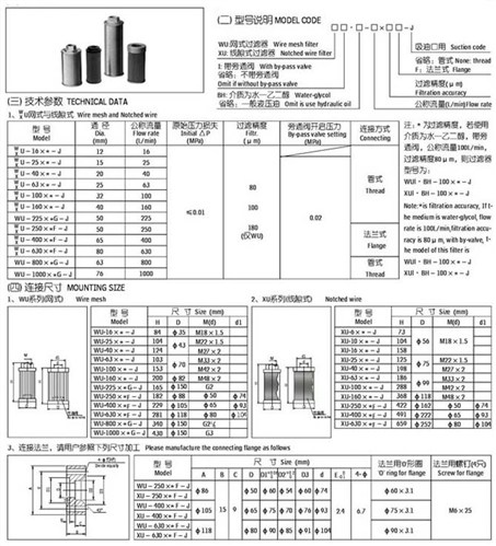 吸油過濾器WU-250*80-J屬于粗過濾器,一般安裝在油泵的吸油口處,用以保護油泵避免吸入較大的機械雜質。該過濾器結構簡單,通油能力大阻力小,并設有管式、法蘭式連接,分網式和線隙式兩種。